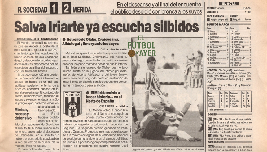 El CP Mérida (primer equipo extremeño que alcanzó la máxima categoría del fútbol español) debutó entre los grandes en la Liga 1995/96 y en la jornada 8 abrió su cuenta de victorias: 1-2 a la Real Sociedad en Anoeta. El conjunto txuri-urdin llevó la iniciativa, pero no le alcanzó con el peligro del dúo Valery Karpin-Gica Craioveanu para superar al recién ascendido y el público vasco despidió con una fuerte bronca a los suyos. Craioveanu, que debutó en Anoeta, estrelló un balón al poste con 0-0. Los de Sergio Krešić, defensivos y efectivos, dieron primero y luego volvieron a golpear para darse un gustazo de Primera. Serhiy Pogodín adelantó al Mérida en el minuto 36, Karpin empató de penalti en el minuto 64 y Juanma Prieto, el gran artillero Romano, selló la conquista del feudo donostiarra en el minuto 71. Este choque, por otro lado, dejó otros debuts en la Real y, por consiguiente, en Primera: Roberto Olabe y Unai Emery. No obstante, cualquier hecho quedó eclipsado por estos tres primeros puntos del Mérida en la división de oro. Triunfo emeritense con honores.